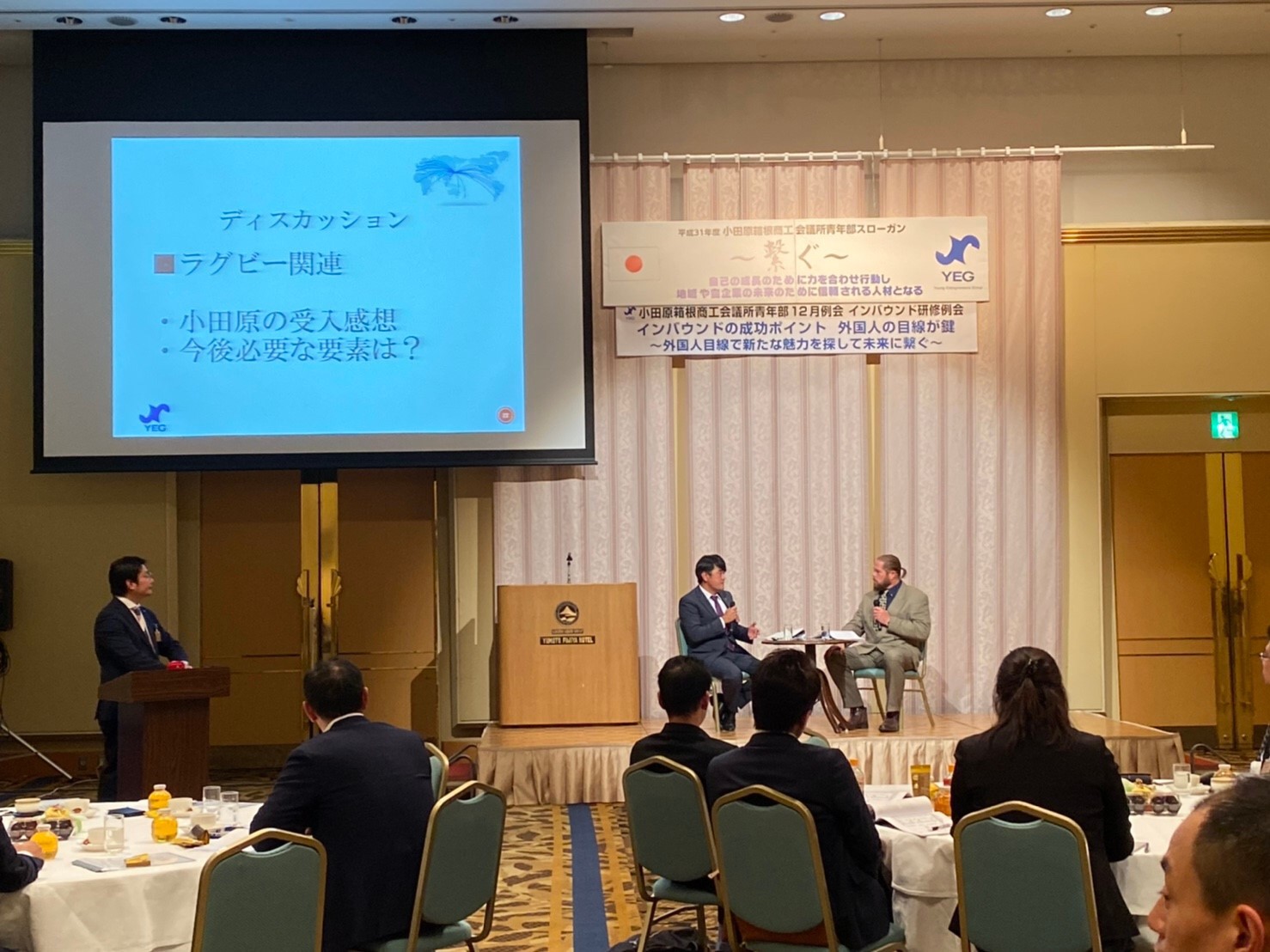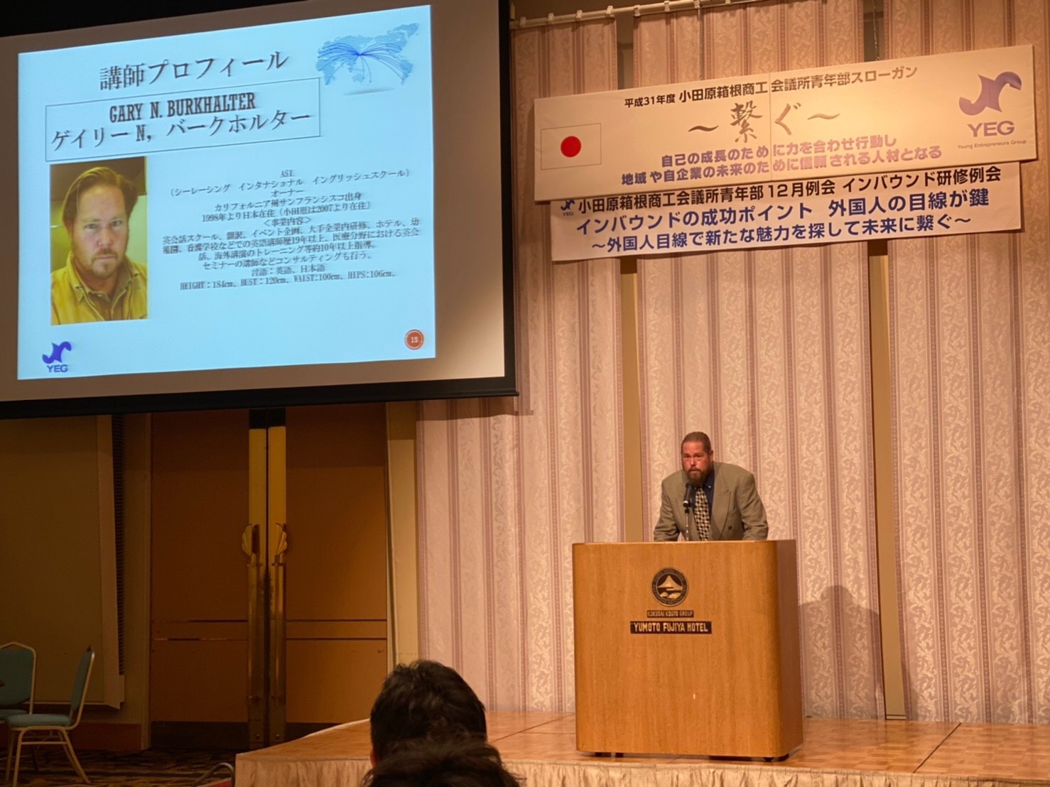 例会では、実際にアメリカ人でもあり小田原の地で事業を営むゲイリー・N・バークホルター氏をお招きし、ラグビーワールドカップの際の小田原箱根地域の受入体制についてや、日本に来て気になったこと・もっと〇〇した方が良いのでは?など、外国人から見た小田原箱根についての「外国人目線」からの様々な角度からの意見をうかがいました。