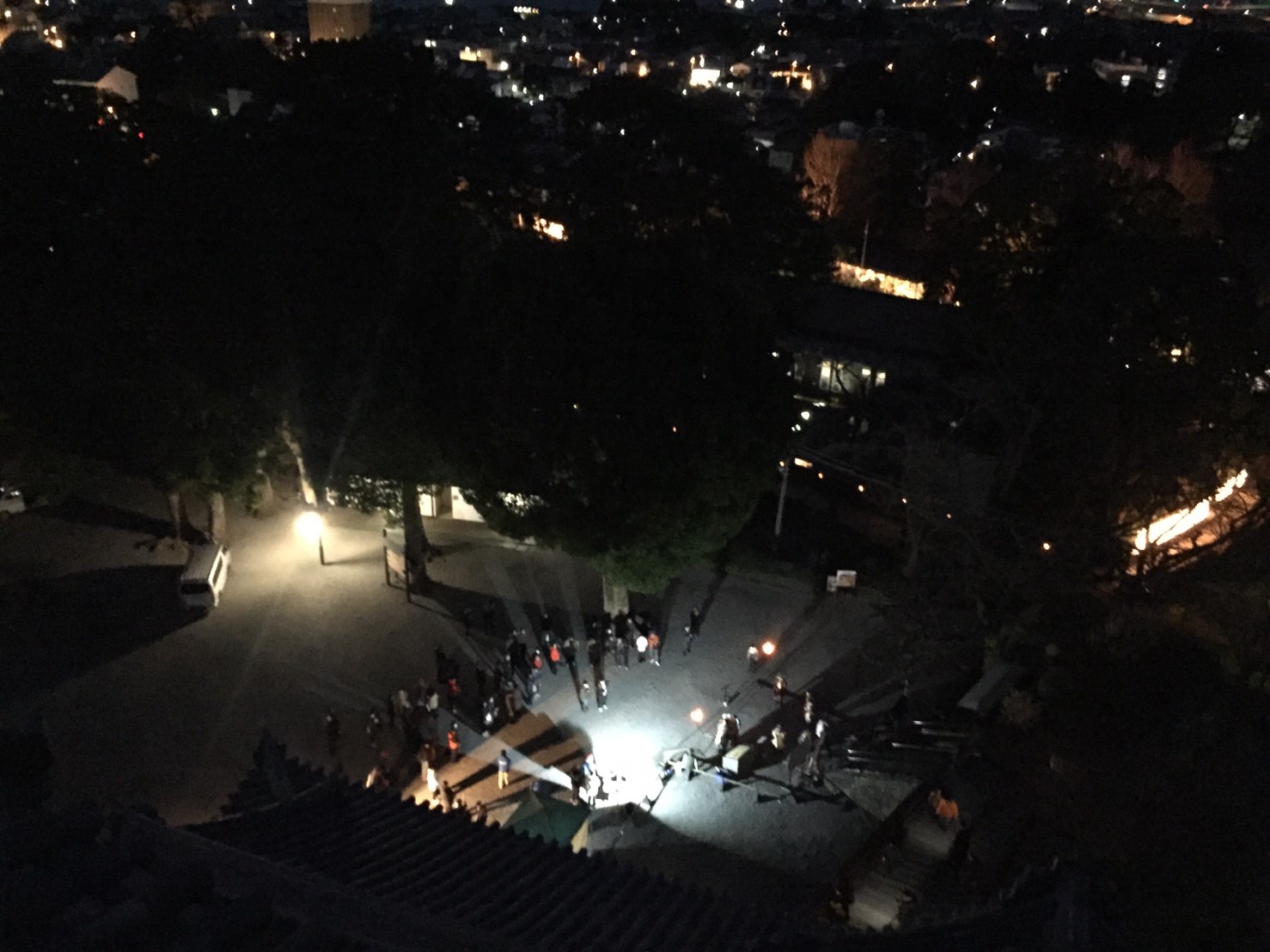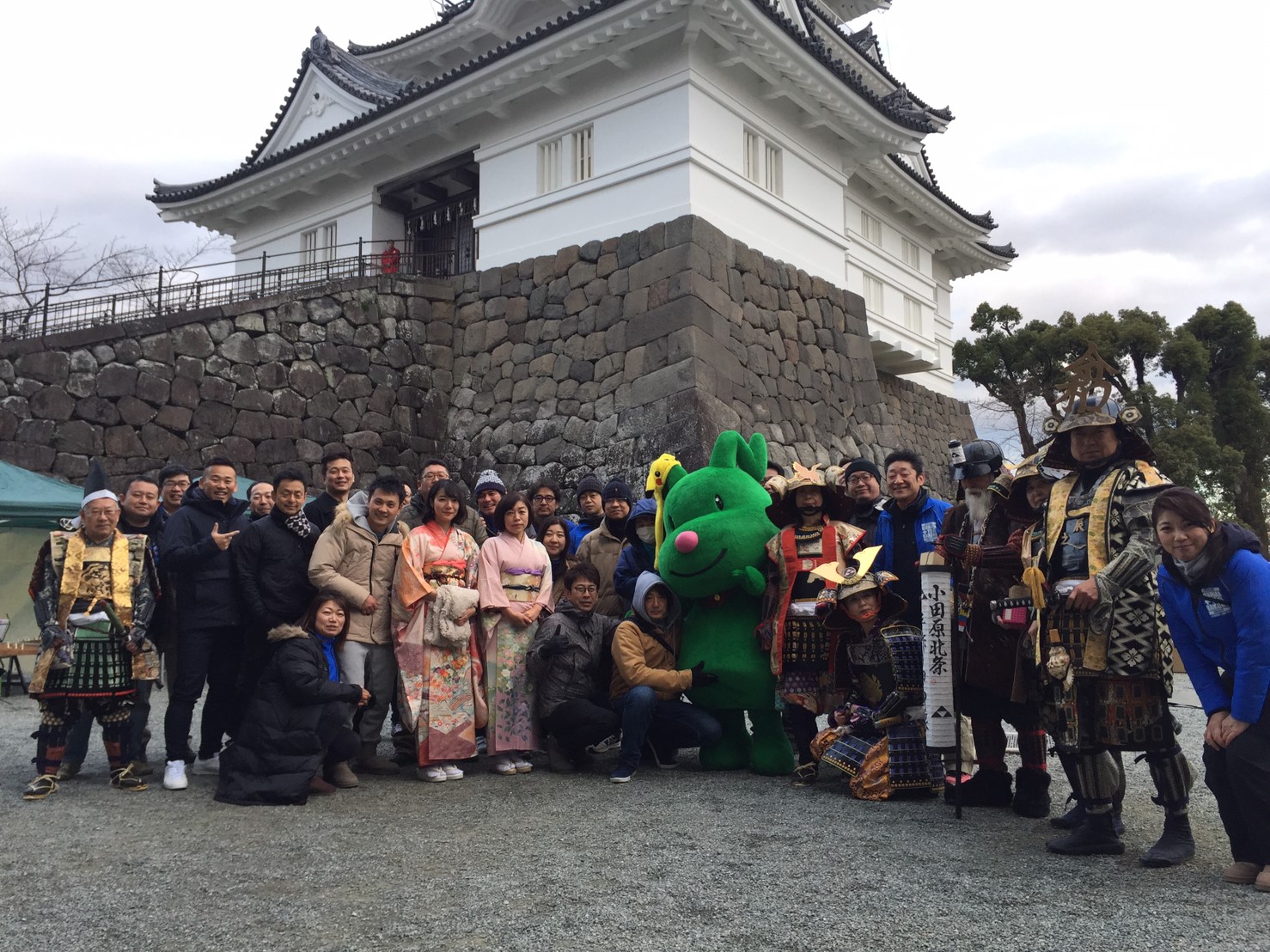 6時10分より会長挨拶、加藤市長の挨拶が行われ、甲冑隊の方に参加者の方々のお名前が一名一名読み上げられる中、いよいよ登閣。天守閣5階の展望デッキから日の出を待ちました・・