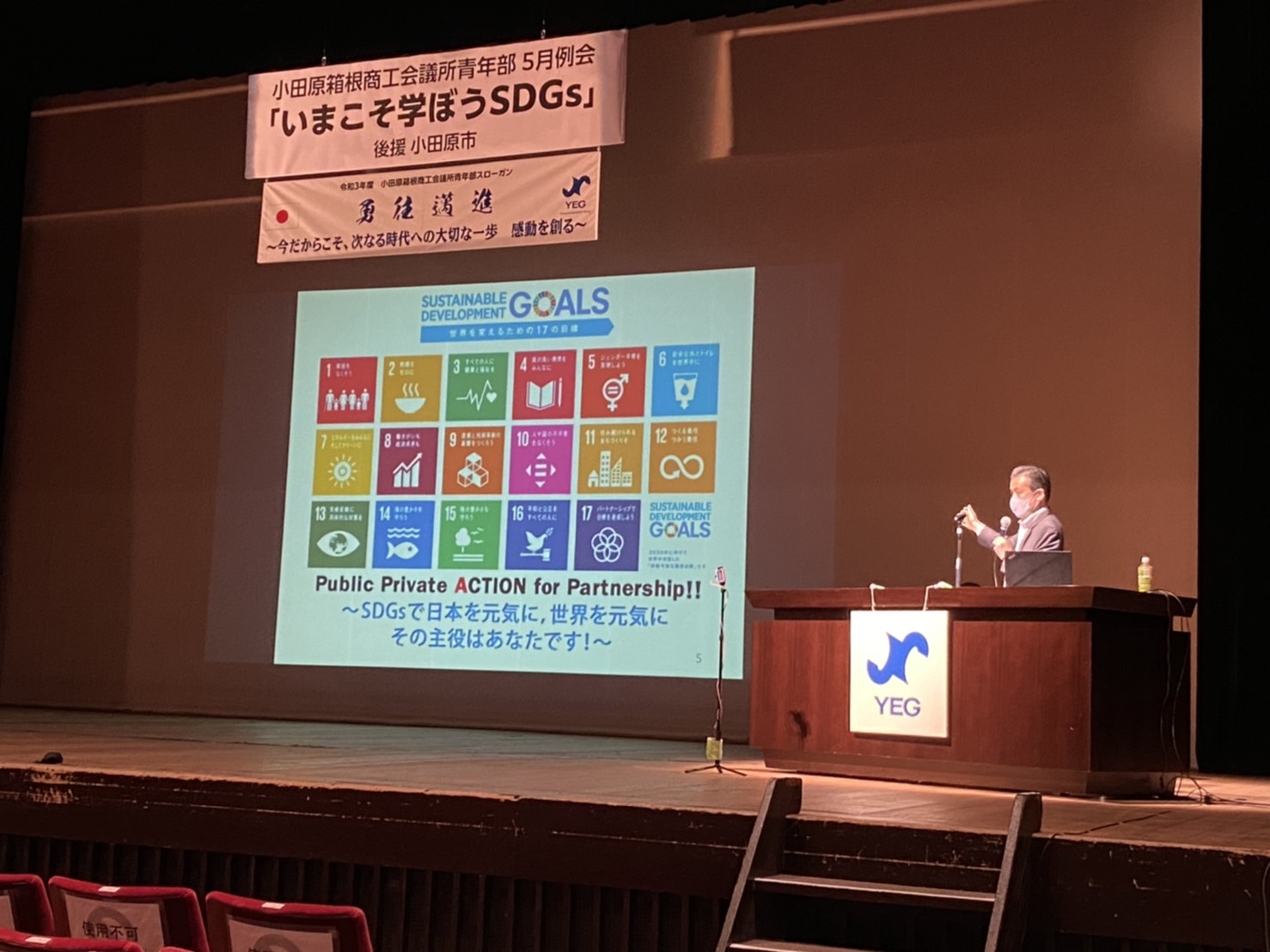 小田原市民会館大ホールで5月20日、5月例会「いまこそ学ぼうSDGs」を開催しました。SDGs(エスディージーズ)とは、2015年に国連で採択された、貧困や気候変動などあらゆる問題の解決を目指す国際社会の共通目標です。