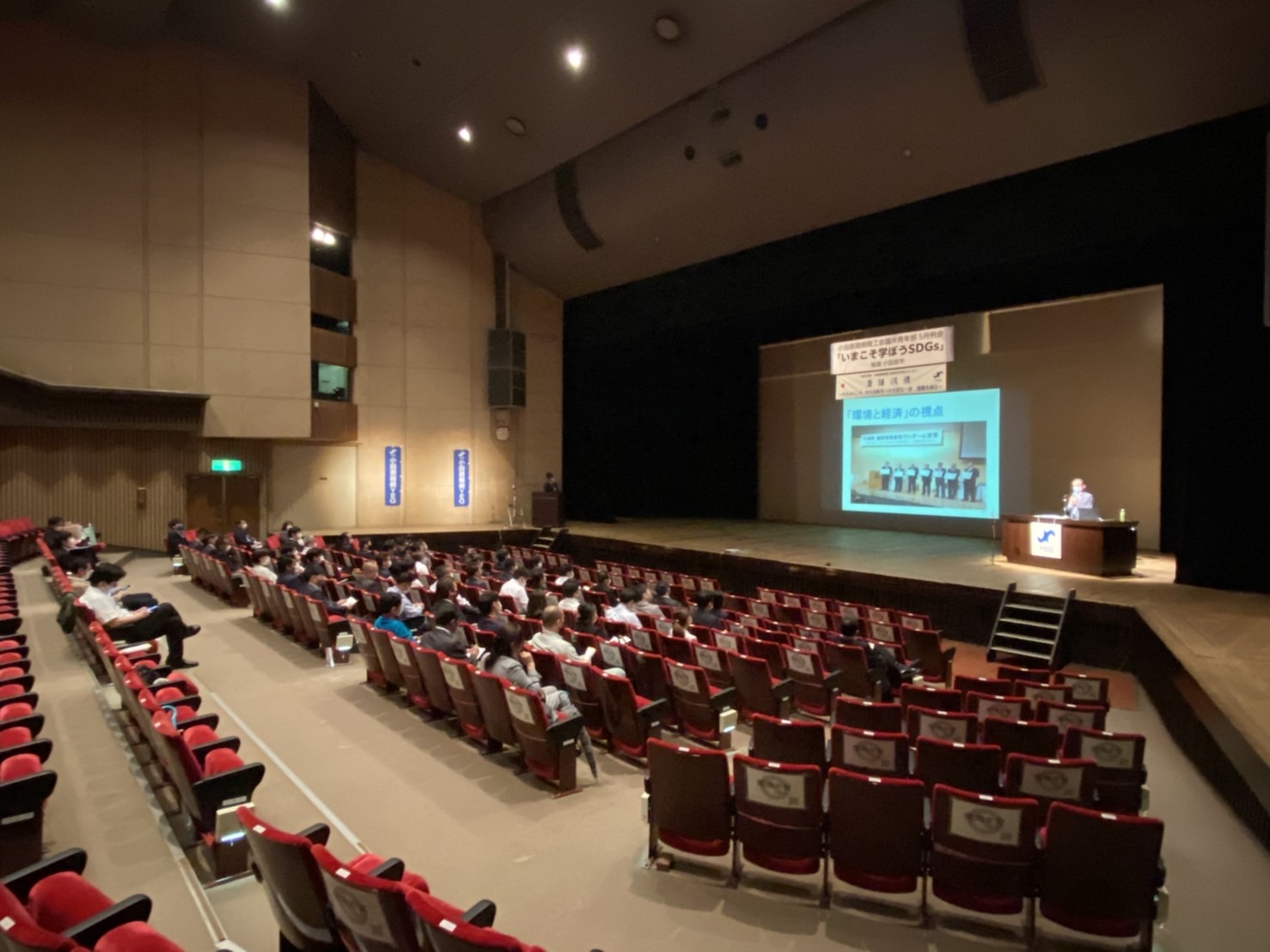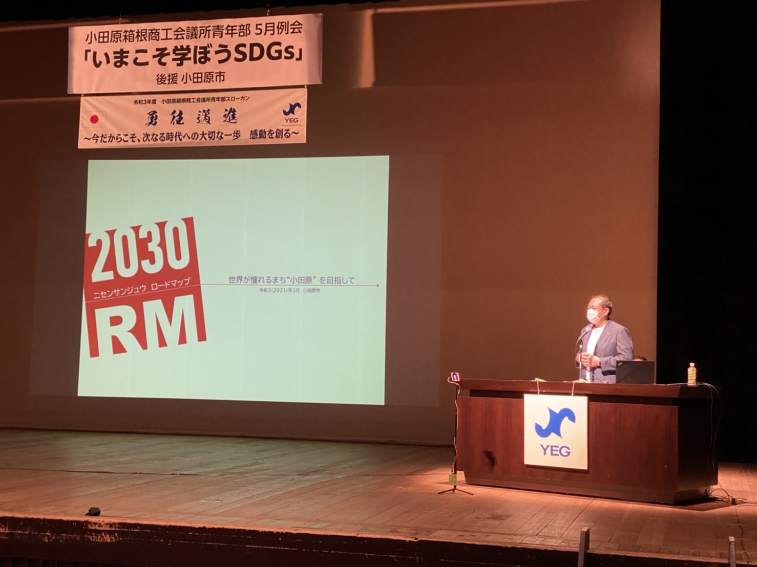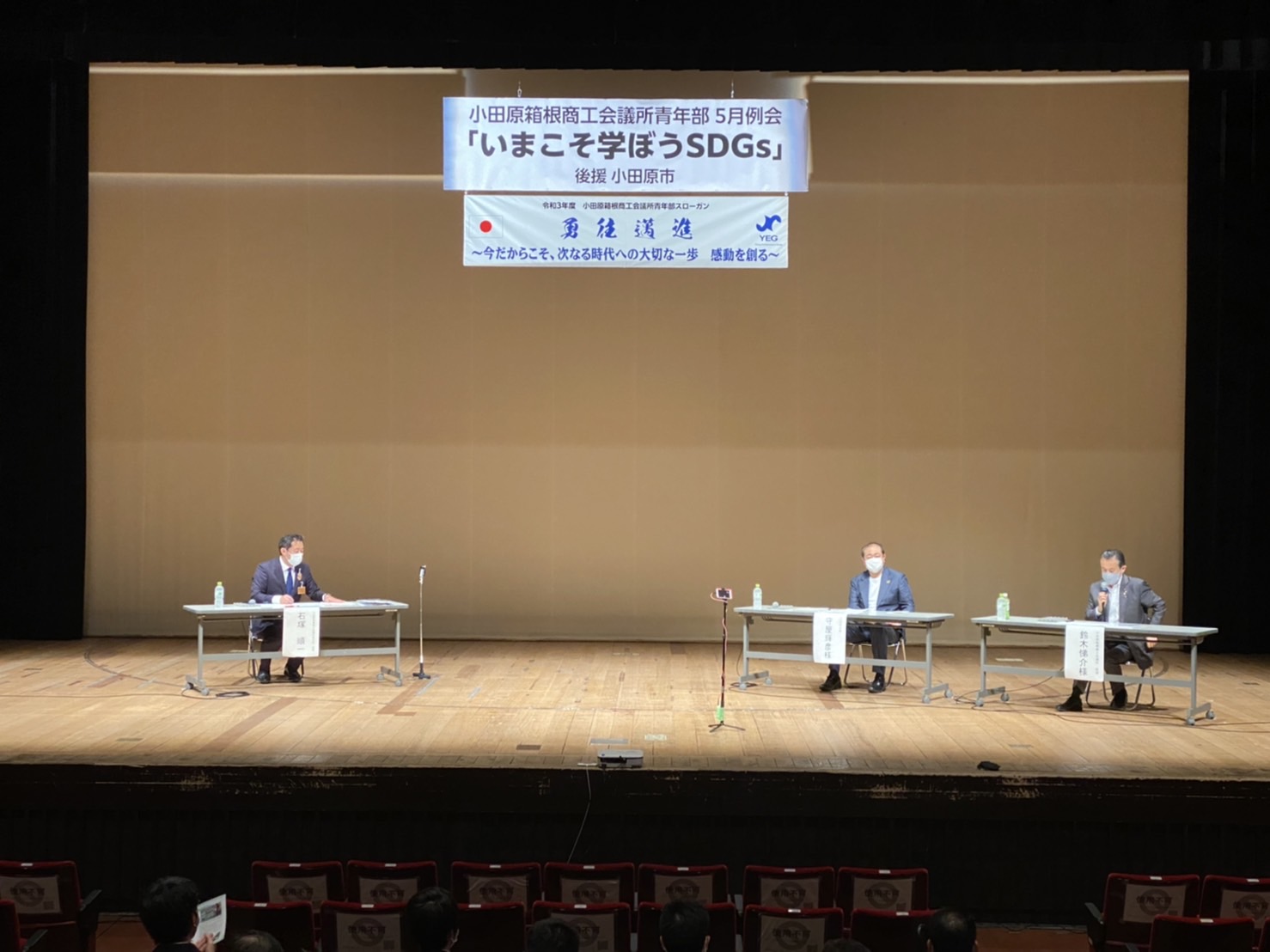 講師には守屋輝彦小田原市長と鈴木悌介小田原箱根商工会議所会頭をお迎えし、それぞれのお立場から、「SDGsの理念」「地域の中小事業者がSDGsに取り組む意義」「持続可能なまちづくり」等についてご講演いただきました。後半のパネルディスカッションでは当YEGの石塚会長にも参加いただき、質問を交えながら理解を深めることができました。