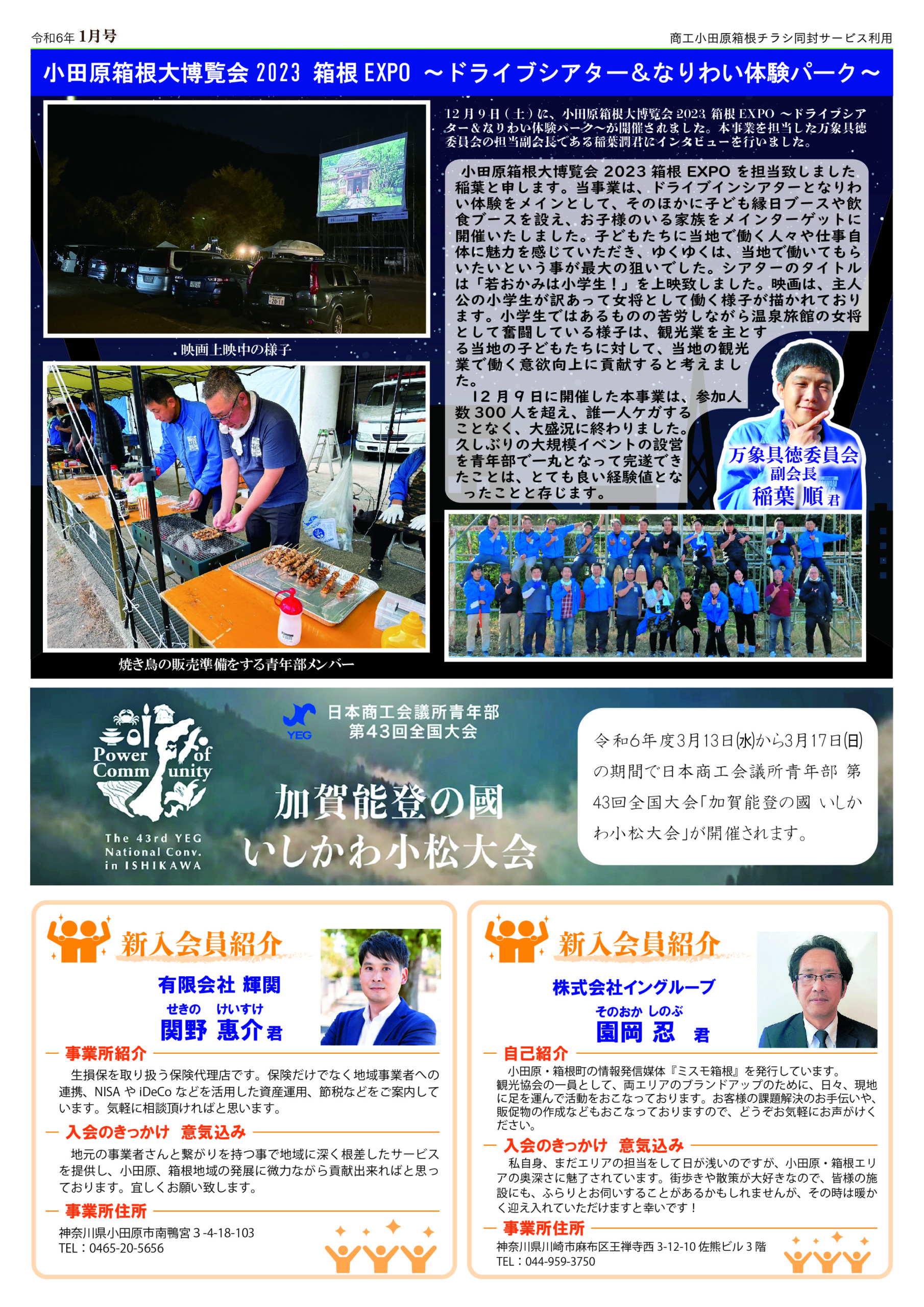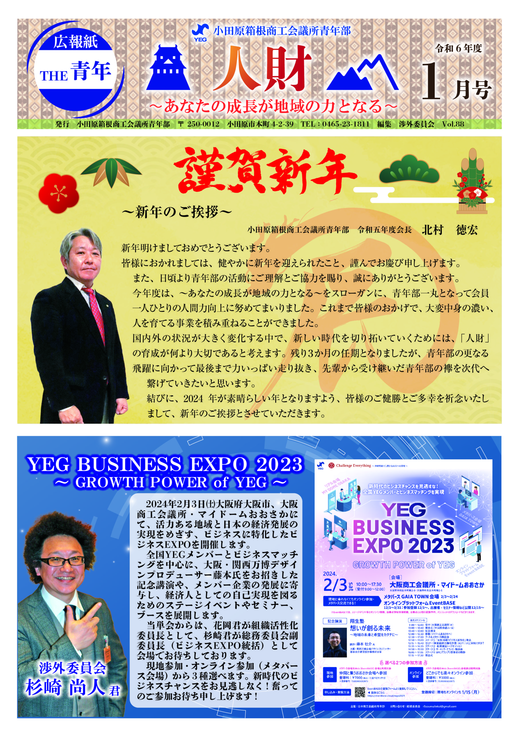 新年の会長挨拶、日本YEG事業告知、小田原箱根大博覧会事業報告、全国大会告知、新入会員紹介について取り上げております!